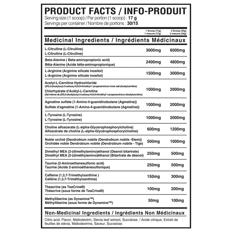 With innovative agents like TeaCrine and Dynamine , stay focused from the beginning to the end of your workout, without any crash . With 6g of citrulline and 4,800mg of beta-alanine , this pre-workout offers unmatched performance for those who are afraid of nothing.